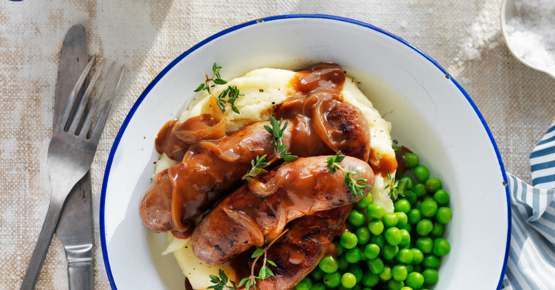 sausages, rich, hearty onion gravy, creamy mashed potato, seasonal vegetables)